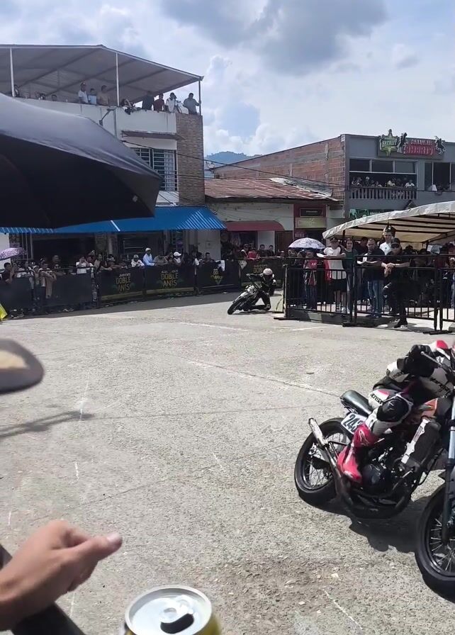 two motorcyclists performing stunts in a town square. A crowd of people is watching the performance from behind barricades. The motorcyclists are wearing helmets and protective gear. They are riding in circles and leaning low to the ground. A hand holding a yellow and silver beverage can is visible in the lower left corner of the frame. Buildings surround the square and people are watching from rooftops and balconies. The sky is partly cloudy.