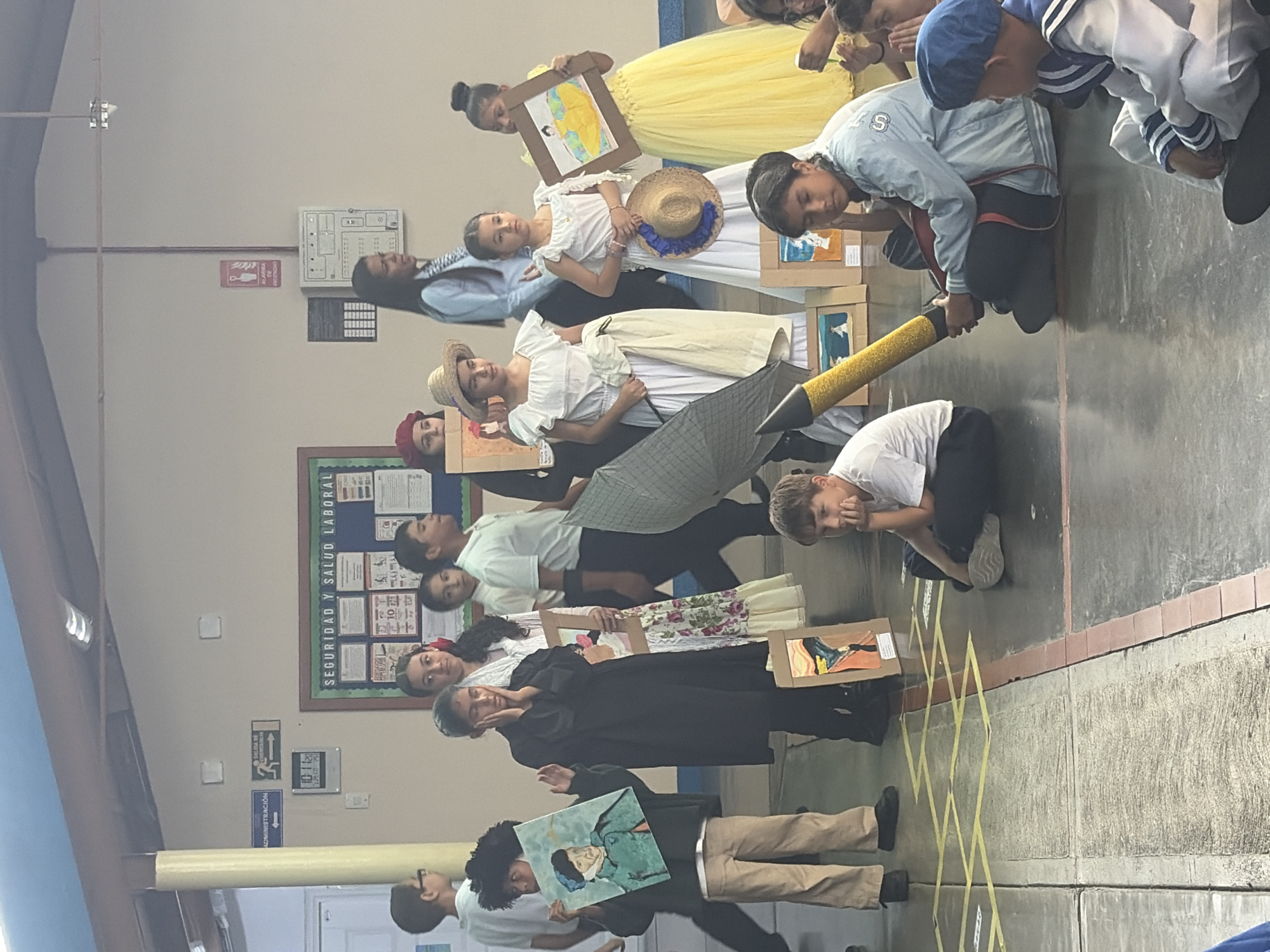 The image depicts an indoor or semi-outdoor event at an educational institution in Guayana City, Venezuela. The setting features light-colored walls, a concrete floor with visible yellow tape markings, and a prominent yellow-painted column. Overhead, structural beams and fluorescent lights are visible. On the walls, a blue bulletin board titled "SEGURIDAD Y SALUD LABORAL" (Occupational Safety and Health) is mounted, along with a white sign indicating "ADMINISTRACIÓN" (Administration) with an arrow, an emergency exit sign, a digital clock displaying "10:11" or similar, a fire alarm panel, and a red "ALARMA DE INCENDIO" (Fire Alarm) sign. Approximately 15-20 individuals, primarily children and adolescents, are present, alongside at least one adult female. Many of the children are dressed in costumes or attire suggestive of historical periods or artistic representations. * A boy on the left, wearing a dark coat and pants, holds his hands to his face in a pose reminiscent of Edvard Munch's "The Scream." A framed print of "The Scream" rests on the floor in front of him. * To his left, another boy in a dark top and tan pants holds up a framed artwork resembling Vincent van Gogh's "Self-Portrait with a Blue Cap." * Several girls are dressed in white dresses, some in a traditional Venezuelan style, with straw hats. One girl in a white dress holds a straw hat with a blue ribbon, while another in a bright yellow full-length dress holds a framed painting of a woman in a yellow dress. * An adult female in a light blue and white patterned shirt stands towards the back, observing the scene. * Among the children seated on the floor, a boy in a white t-shirt and dark pants rests his chin on his hand. A girl in a light blue jacket and dark pants holds a large, grey and yellow prop shaped like a pencil. Another boy in a white and blue sailor-style uniform is seated in the foreground. * Other children in casual clothing are visible in the background and foreground, some standing, some seated. The scene suggests a cultural presentation, school play, or art exhibition.