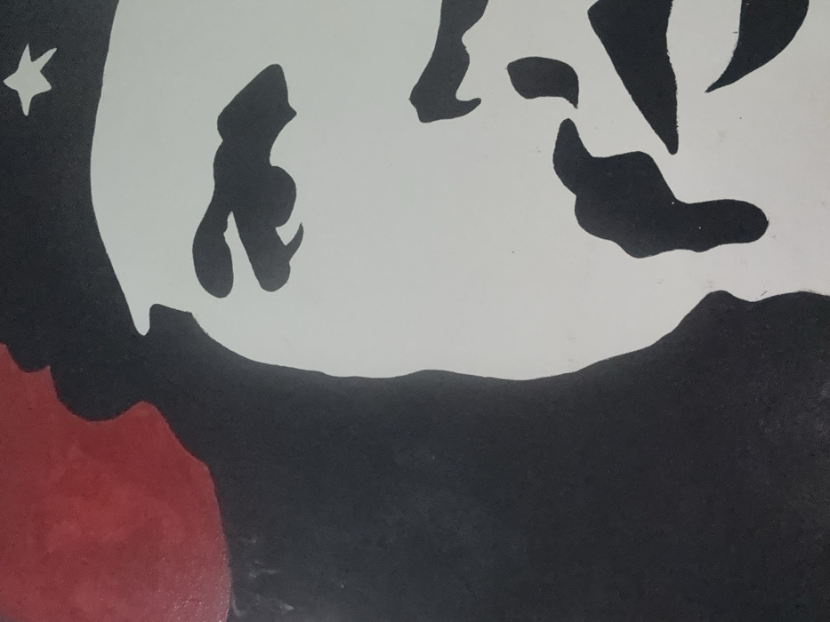 section of artwork with a limited color palette of white, black, and red. The upper portion is predominantly white with irregular black shapes. A star is visible in the upper left corner. The lower section is mostly black, broken by a red blotch on the left side, which appears to be painted in a somewhat textured manner. The overall style suggests a poster or stencil art.