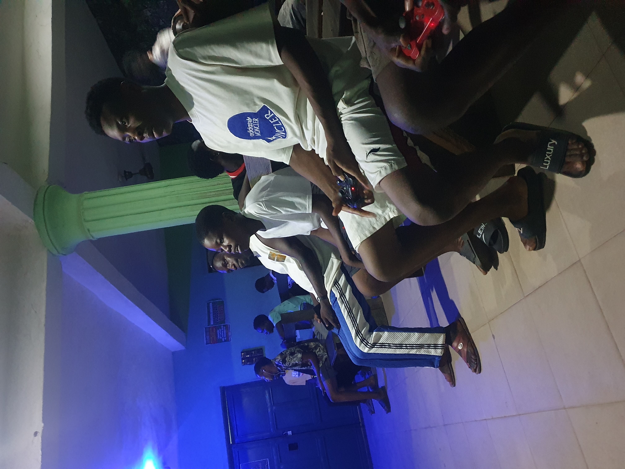 Seven young adult males are present in an indoor gaming environment, presumably a commercial establishment in Unknown, Unknown. The room features blue walls, a white ceiling with visible beams, and a prominent light green decorative pillar on the right. The floor is covered in light brown square tiles. Ambient blue lighting illuminates the scene, with a ceiling fan visible overhead behind the pillar. Multiple individuals are seated on wooden benches, facing an unseen display, engaged in or observing video gameplay. The subject in the right foreground wears a white t-shirt with a blue "adidas MONCLER" logo and white shorts, holding a black game controller with red illuminated elements and an "ANCHE" brand mark. His feet are in black slides labeled "Luxury." To his left, another subject wears blue track pants with white side stripes and brown sandals. A red game controller is partially visible in the lower right, held by an obscured individual. Further left, a subject in a patterned shirt wears earphones. On the left wall, a dark blue double door is present, alongside signs indicating services such as "CHARGING OF LAPTOP" and displaying numerical sequences.