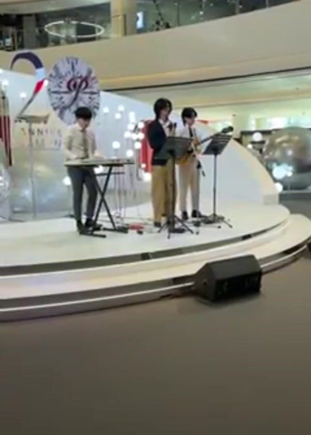 band performing live on a stage in a large shopping mall. The band consists of three people: one playing a keyboard, one singing, and one playing a saxophone. The stage is circular and decorated with white lights and a sign that reads "20th Anniversary Siam." The mall is brightly lit and has multiple levels, with people visible on the upper levels. A black speaker is on the floor in front of the stage.