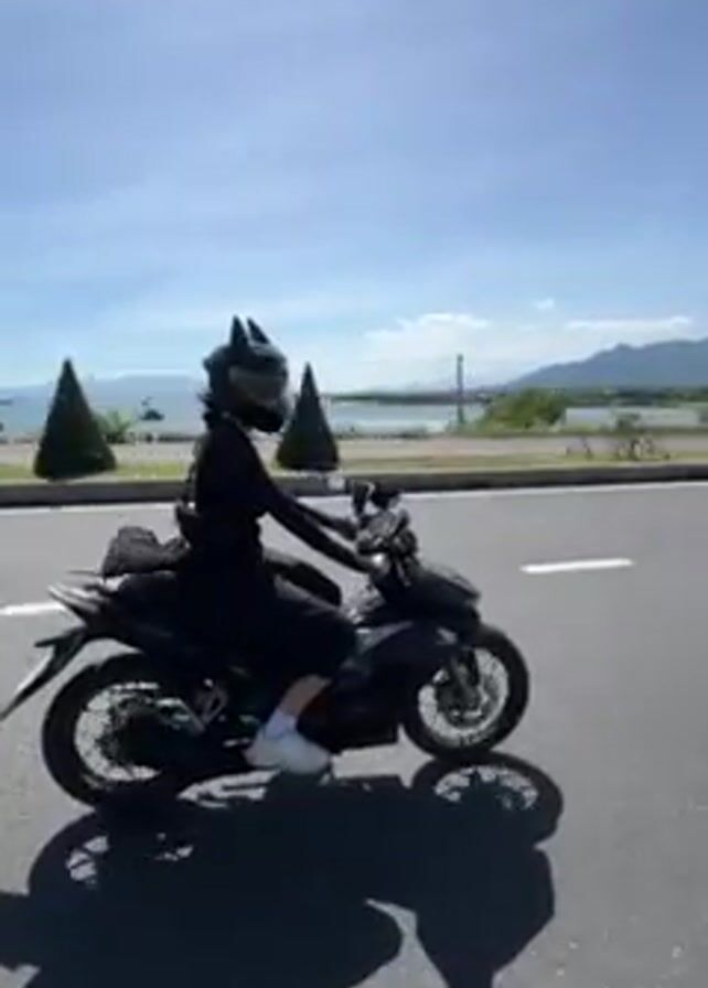 A video depicts a person on a black motorcycle, stopped on a paved road adjacent to a beach area with water and greenery visible in the background. The rider is facing to the right of the frame, wearing a full black outfit with white sneakers, and a black helmet adorned with cat-like ears. They sit stationary on the motorcycle as other vehicles pass by on the left. Triangular-shaped trees line the beach area, creating a visual border along the coastline. The sky is bright and clear, suggesting a sunny day.