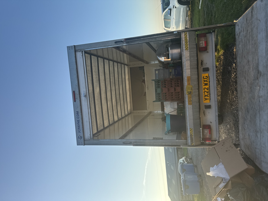 The image displays the rear of a white box truck (lorry) with its hydraulic lift gate lowered to ground level. The truck's UK registration plate, YX22 WXG, is centrally visible on the rear bumper. The company name "JCPAYNE.COM" is displayed on the upper rear frame. Inside the truck's open cargo bay, various items are stored, including a blue and black plastic bucket, several stacked red and green plastic crates (possibly for bottles or glassware), and a large, domed metal catering item, likely a chafing dish or serving pot. In the immediate foreground, on the lowered lift gate, a partially open cardboard box contains white plastic bags and other discarded materials, with several black refuse bags positioned to its left. The ground beneath and around the truck consists of a mix of gravel and sparse green grass. To the left of the truck, in the mid-ground, multiple blue wheeled bins are visible alongside a dark-colored car parked near a large, low-rise building with a dark roof, suggestive of an agricultural or industrial structure. To the right of the truck, a white pickup truck is parked on a grassy area. The scene is illuminated by low-angle sunlight under a clear blue sky, indicating either early morning or late afternoon. The environment suggests an outdoor, possibly semi-rural or industrial setting within the city of Northallerton, United Kingdom.