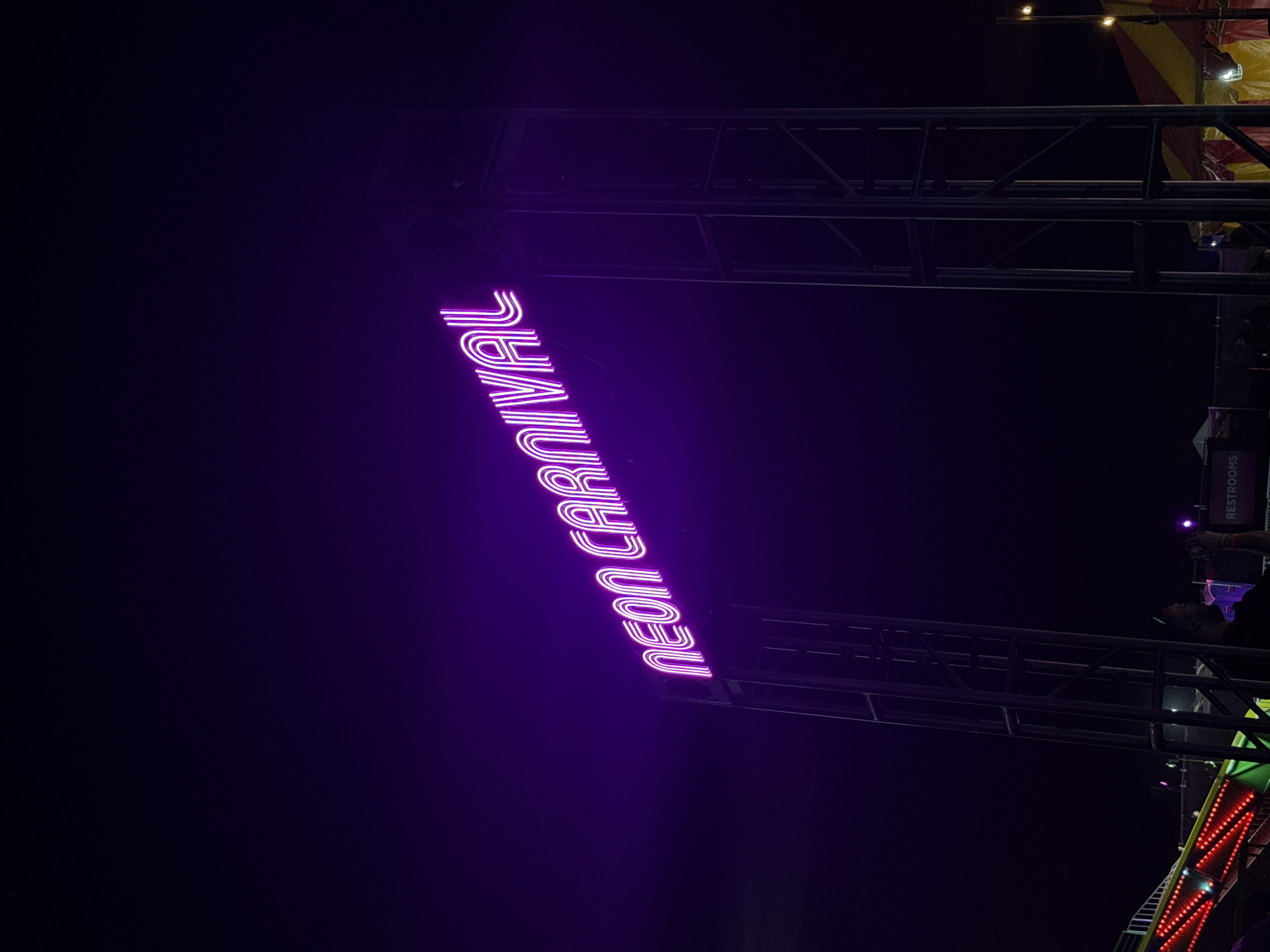nighttime scene in Thermal, California, featuring a neon sign that reads "NEON CARNIVAL" in a vertical orientation. The sign is brightly lit in a purple hue and is mounted on metal scaffolding. The background is mostly dark, with other structures and lights visible, including what appears to be a partial view of a tent or awning and the top of a ride with red lights. A sign that says “RESTROOMS” is also visible. A person is also visible in the image to the right of the “RESTROOMS” sign.