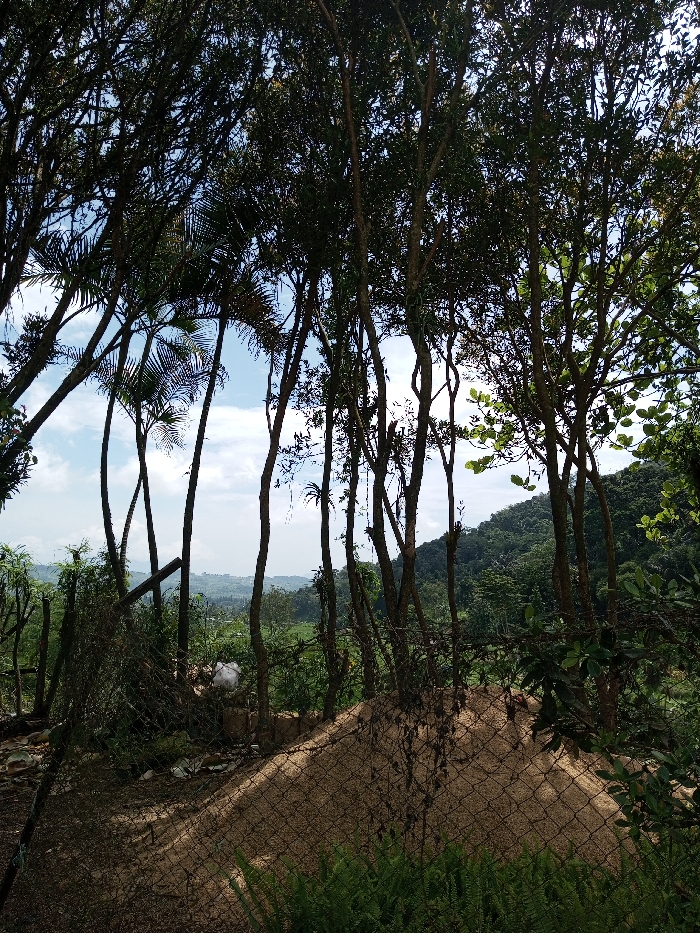 This image depicts an outdoor, elevated landscape view in Ariyalai, Sri Lanka, characterized by dense vegetation under a partly cloudy blue sky. In the immediate foreground, a chain-link fence is visible, partially obscured by green ferns and other low-lying foliage. Behind the fence, a large, light-brown mound of granular material, resembling sand or soil, is present, with sections covered by a dark mesh. To the left of this mound, debris including a crumpled white sack is observable. The midground is dominated by numerous tall, slender tree trunks, some with sparse leaves and others with denser green canopies, creating a vertical screen. Several palm-like trees with visible fronds are interspersed among the other trees on the left side. Beyond these trees, a valley or low-lying area with scattered green fields and distant structures is visible. The background features densely forested hills or mountains rising under the horizon. No individuals or specific actions are identifiable within the scene.