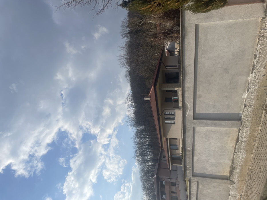 A daytime exterior shot in Starozagorski bani, Bulgaria, features a residential street view. The foreground presents a light grey concrete perimeter wall, approximately 1.8 meters high, with horizontal and vertical indentations forming panels, situated above a rough concrete curb and a paved edge. To the right, a narrow, yellowish-green evergreen shrub is partially visible. In the midground, beyond the wall, stands a single-story residential house with light beige stucco exterior walls and a reddish-brown tiled hip roof. The house includes rectangular windows with dark frames and a covered porch area with a supporting column, from which a small, multi-colored textile is suspended. To the left, a portion of another similar two-story residential building with a balcony is discernible. The background consists of a dense, leafless deciduous forest covering a hillside. The sky overhead is partially clear blue, interspersed with white and light grey cumulus and stratocumulus clouds, which are more concentrated and darker on the right side. No people are visible.