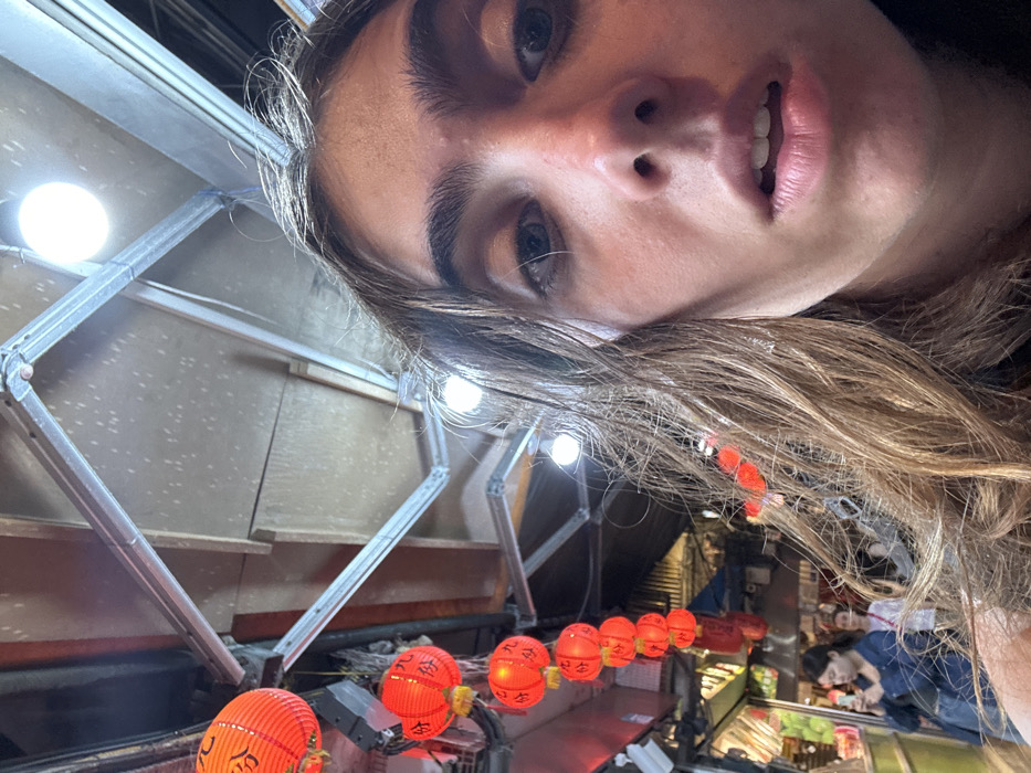 A female individual is depicted in a close-up selfie, occupying the right half of the frame from forehead to chin, with light brown hair and a slightly open mouth. A white earbud is visible in her right ear. The background reveals an illuminated street market scene in the Jiufen Old Street area of Ruifang District, New Taipei City, Taiwan. A prominent vertical string of at least eight red Chinese lanterns, each bearing Chinese characters "九份" and yellow tassels, hangs on the left side of the image. Above, a ceiling structure features exposed metal beams and multiple bright circular LED lights. In the mid-ground, a woman in a dark top holds and looks at a smartphone, with additional indistinct figures and market stalls visible further in the background. The lighting is artificial, suggesting an evening or nighttime setting.