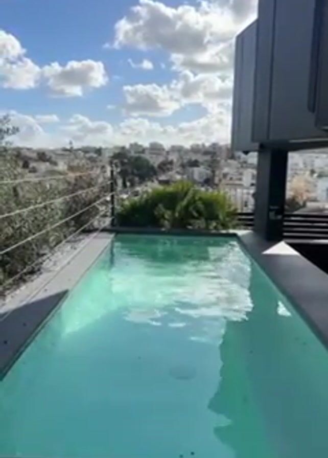 rooftop pool with a view of the city. The pool is rectangular and has light blue water. The surrounding area is tiled and has a metal fence around it. In the background, there are buildings and trees. The sky is blue with white clouds. The camera pans from left to right to show more of the city view.