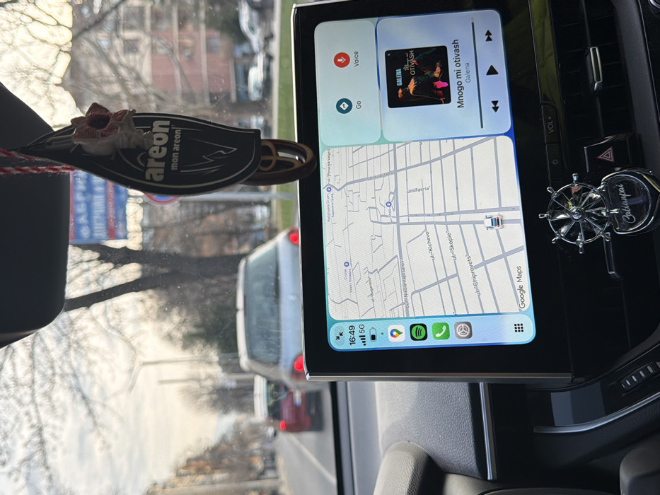 The image displays a forward-facing perspective from inside a vehicle, looking out onto a city street in Plovdiv, Bulgaria. The central feature is the vehicle's infotainment screen, which shows a Google Maps interface at 16:49, displaying local street names in Cyrillic, including "ул. Кичево," "ул. Чипровци," and "бул. Никола Вапцаров," verifying the Plovdiv location. A music player widget on the screen displays the track "Mnogo mi otivash" by "Galena." Hanging from the interior rearview mirror by a red and white patterned cord is a dark, leaf-shaped "areon" brand air freshener. A metallic ship's wheel ornament, inscribed with "Catianpai," is affixed to a dashboard air vent. Through the windshield, a two-lane road is visible, occupied by several vehicles in traffic. Immediately ahead is a silver hatchback, followed by a red car with its brake lights illuminated. The roadside is lined with bare deciduous trees. Multi-story urban buildings are discernible behind the trees, beneath an overcast or partly cloudy sky. Distant hills or mountains are visible on the horizon. No human subjects are explicitly depicted.