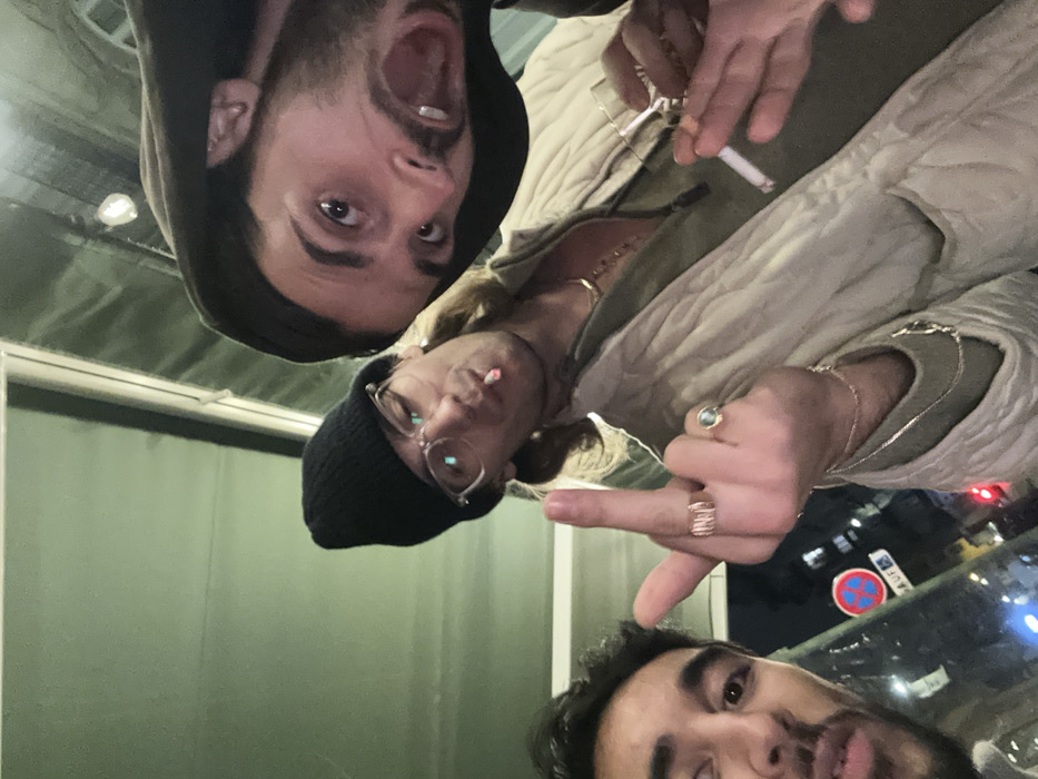 A nighttime selfie captures three men outdoors in an urban environment in Paris, France