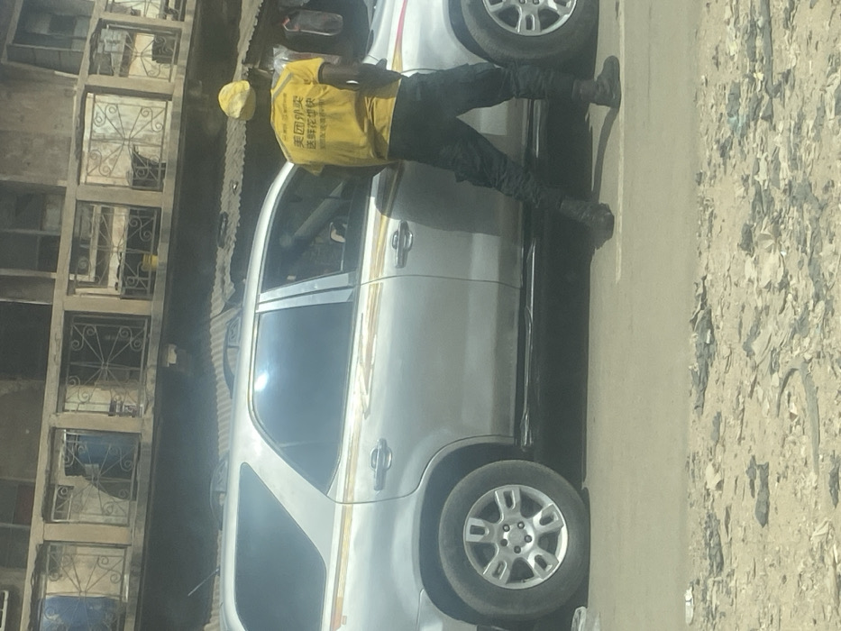 An adult male stands beside the front passenger side of a silver sport utility vehicle (SUV) on a paved road in Sabon Gari East, Nigeria