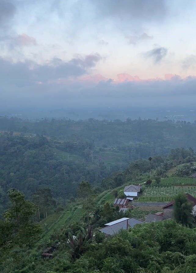 n expansive landscape view from an elevated position, likely a hillside or mountain slope, overlooking a valley filled with lush green vegetation, rice paddies, and scattered dwellings. The sky is overcast with a mix of grey and pastel pink hues, suggesting either early morning or late evening light. In the mid-ground, there are several small buildings with red-tiled roofs nestled amongst the greenery. A road is visible and at one point, a motorbike drives by. The video is generally still, capturing the serenity of the natural landscape.
