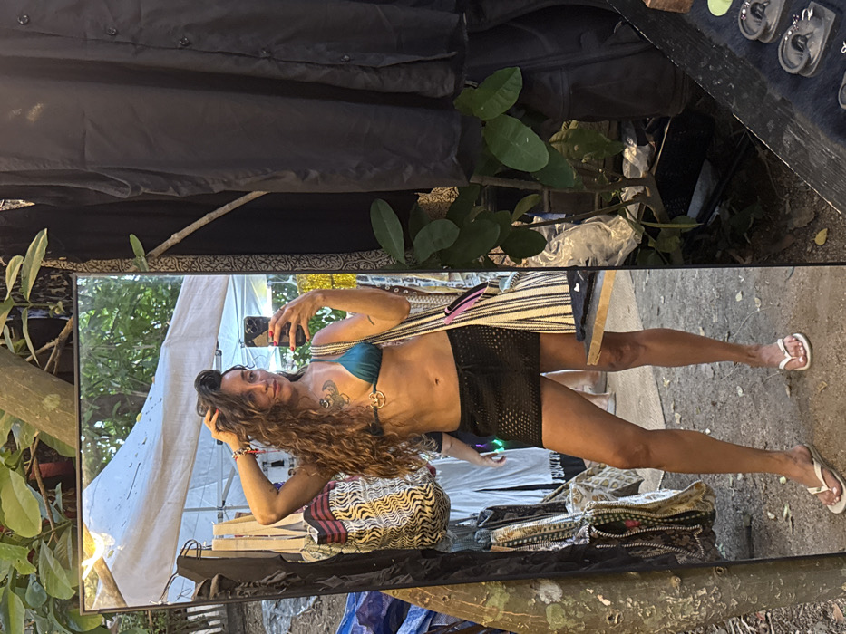 A female subject is captured in a full-length mirror selfie, positioned outdoors in Moo 1, Thailand, within what appears to be a market or retail stall environment. The subject, a woman with long, wavy brown hair, wears a teal bikini top with a gold ring embellishment, a black mesh mini-skirt, and white flip-flops. Her left hand is raised to her hair, while her right hand holds a dark-colored smartphone, used to take the photograph. A striped tote bag with a pink strap is slung over her right shoulder. She displays a tattoo on her upper left chest and multiple bracelets on her left wrist. The mirror's reflection reveals a background with a white tent canopy, various fabric goods or clothing items displayed on racks, and dirt or gravel ground. The lower left of the reflection shows the legs and feet of another individual in light-colored footwear. Green foliage is visible at the top and edges of the reflected scene. Outside the mirror's frame, to the right, a dark sleeveless shirt hangs on a display. Below it, a potted plant with green leaves is visible. Further right and lower, a dark display stand holds several clear, plastic-like objects, possibly earrings or similar small merchandise. A tree trunk or thick branch extends diagonally across the top right portion of the image. The mirror itself has a black frame.
