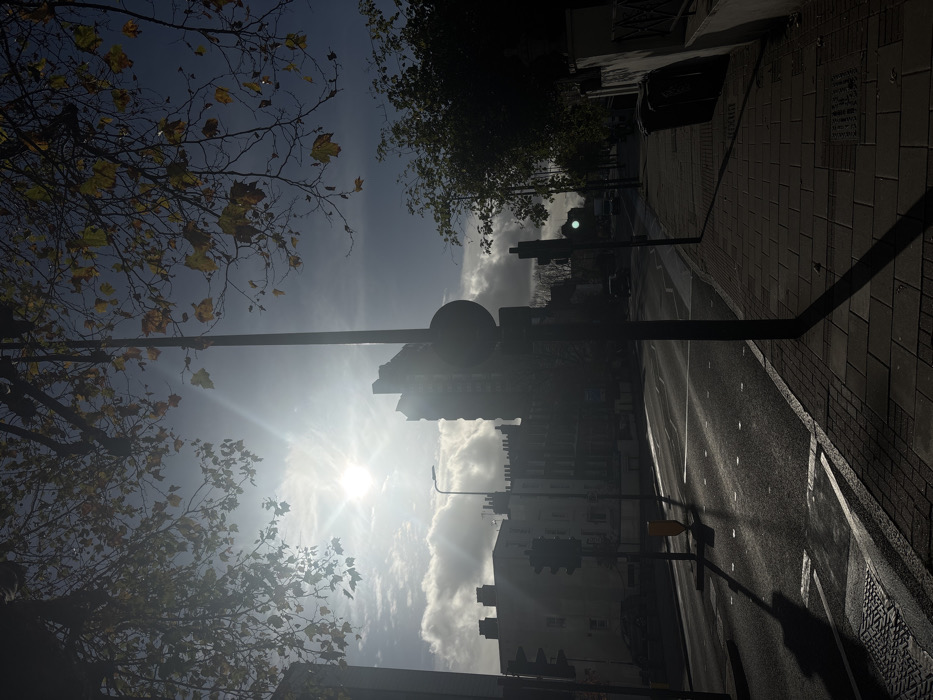 The image presents a sunlit street scene in London, United Kingdom, captured with strong backlighting. The sun, visible in the upper-left quadrant, emits significant lens flare, illuminating the sky, which displays a mix of bright white and light blue with some scattered clouds. Sparse, yellowing leaves on tree branches frame the top of the image against the sky. In the foreground, a paved sidewalk on the right features reddish-brown and grey slabs, heavily shadowed by a central dark pole and an unseen structure to the right. Two dark waste bins rest against a low wall on the right side. The asphalt road surface on the left appears reflective in areas, featuring white dashed and solid lane markings, a pedestrian crossing with a yellow beacon pole, and a stop line. The midground includes a multi-lane road with a set of dark traffic lights silhouetted on the left. Behind these, a row of traditional London terraced houses with multiple chimneys is visible, mostly in shadow. To their right and further back, a prominent, multi-story building with a distinctive, irregular roofline stands silhouetted against the bright sky. The background shows the road receding, flanked by more silhouetted buildings and trees. No individuals are present in the scene. The environment is an urban intersection under bright, high-contrast lighting conditions.