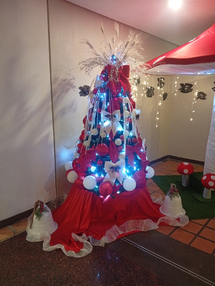 A decorated Christmas tree with red ribbons, white bows, white baubles, and fairy lights sits on a red skirt with white lace trim. Next to the tree, white bell ornaments sit on the floor. Behind the tree, a section of a red mushroom canopy is visible with hanging fairy lights and black mushroom-shaped cutouts. Artificial green grass with small red and white mushroom decorations completes the festive scene.