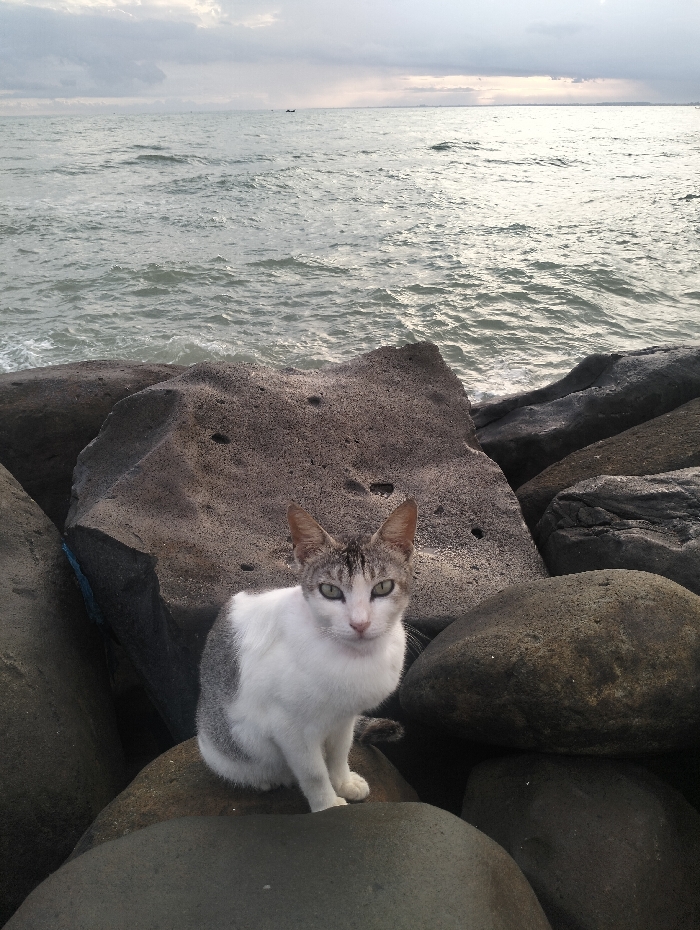 - "A white cat with gray patches sits on smooth, dark rocks near the ocean" by FM-sAcf03, licensed under CC BY 4.0