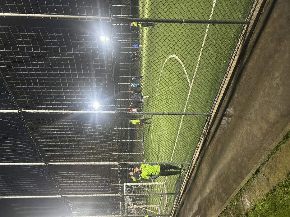 The image depicts a nighttime scene at an artificial turf soccer field in Dimitrovgrad, Bulgaria