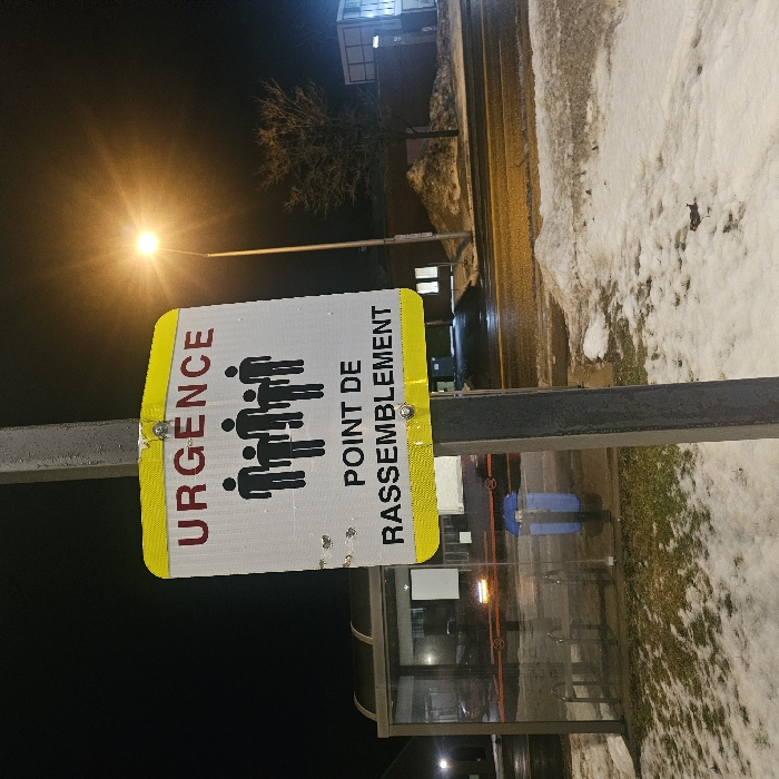 A sign reads "Urgence" and "Point de Rassemblement" next to a silhouette of people