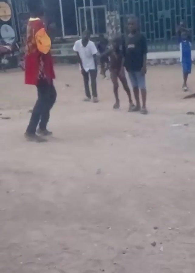 The video depicts a group of children playing on a dirt road. There are five children visible. One child is wearing a red and yellow shirt with black pants. Another is wearing a white shirt. A third child is shirtless, wearing patterned shorts. A fourth child is wearing a black shirt and shorts. The last child is wearing a blue and white soccer uniform. The children are running around and interacting with each other. The environment appears to be a residential area with a building and a parked motorcycle visible in the background. The overall atmosphere seems playful and casual.
