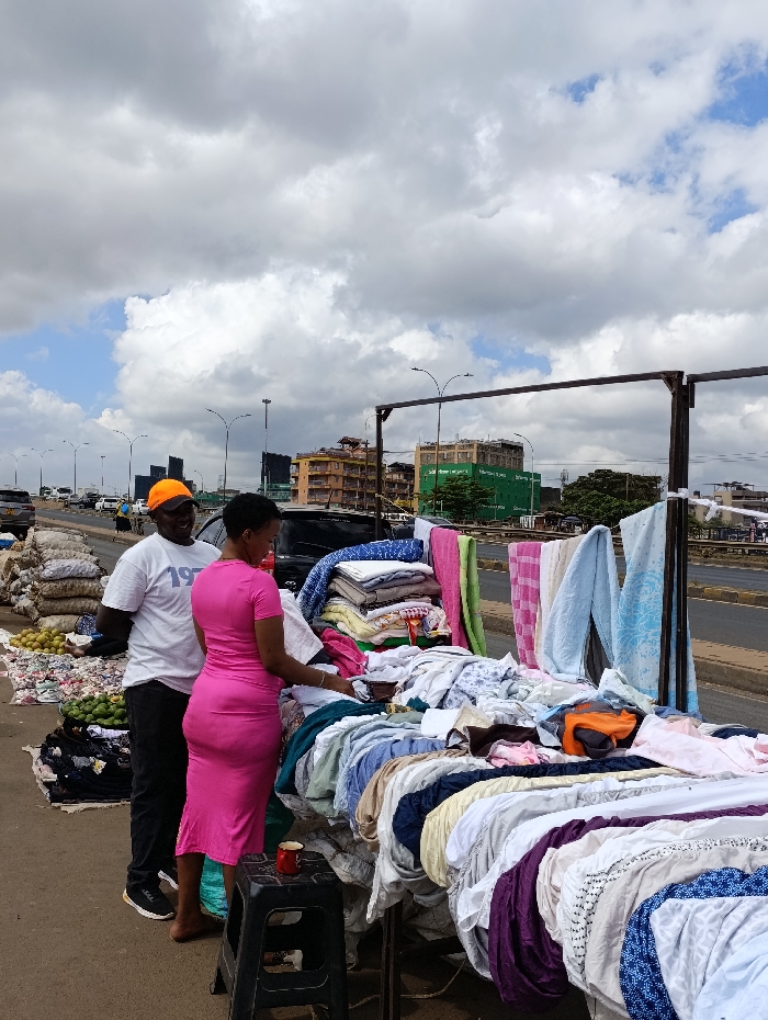 A man in a white t-shirt and orange hat stands next to a woman in a pink dress. They are browsing a sidewalk vendor's display of folded and draped textiles, including towels and sheets. A black plastic stool holds a cup. Bags of produce are nearby. The scene is alongside a road with highway lighting and buildings visible in the background under a cloudy sky.