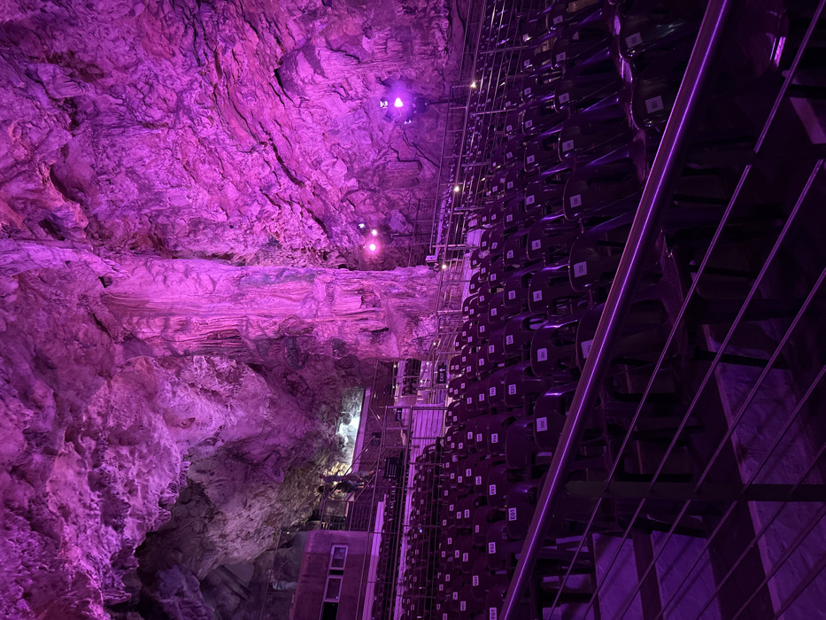 The image displays the interior of St. Michael's Cave, Gibraltar, Gibraltar, configured as an auditorium. The entire scene is bathed in a predominant purple illumination, highlighting the natural limestone formations, including numerous stalactites, stalagmites, and a large central stalagnate column extending from floor to ceiling on the right side. Rows of tiered, dark-colored auditorium seats, all unoccupied, are visible, each chair back bearing a white alphanumeric identifier such as "G02," "F01," "D01," and "C02." Polished metal railings, appearing silver under the purple light, define the seating sections and stairways. In the upper left background, a multi-windowed, rectangular building structure is integrated into the cave wall. Two human figures are partially visible in this area, appearing to traverse a set of stairs or a ramp. Stage lighting fixtures, emitting purple light, are observable within the cave structure.