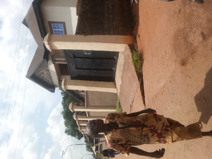 n older man in a brightly colored shirt and pants walking down a dirt road, heading towards a black gated entrance in front of a recently built, tan house. The house has a dark, brown roof, and there are three pillars flanking the gate in front of the property. The street is mostly dirt, with a strip of concrete in front of the house, and some light vegetation. The image was taken in Nnobi, Nigeria, at the coordinates 6.056 latitude and 6.945 longitude. There are two other people visible in the background. The image is taken from a street-level perspective.