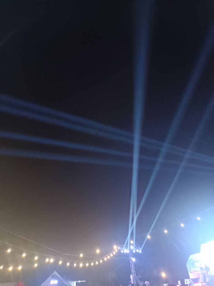 The image depicts an outdoor nighttime event in Ouderkerk aan de Amstel, Netherlands. The dark sky is traversed by multiple distinct, collimated beams of blue-white light originating from sources in the lower right and center, projecting upwards. Several parallel blue light streaks are also visible horizontally in the upper left quadrant. A string of approximately twenty-five warm-toned incandescent bulbs forms a downward arc across the lower-mid section, providing ambient illumination. Below these lights, a partial white pointed roof structure is visible on the left. To the right, a tall metal truss supports the upward-directed blue-white spotlights. A brightly glowing, multi-colored object, likely a stage element or screen, is visible at the far right edge. Silhouetted figures of people are discernible at the very bottom edge of the frame, indicating a public gathering.