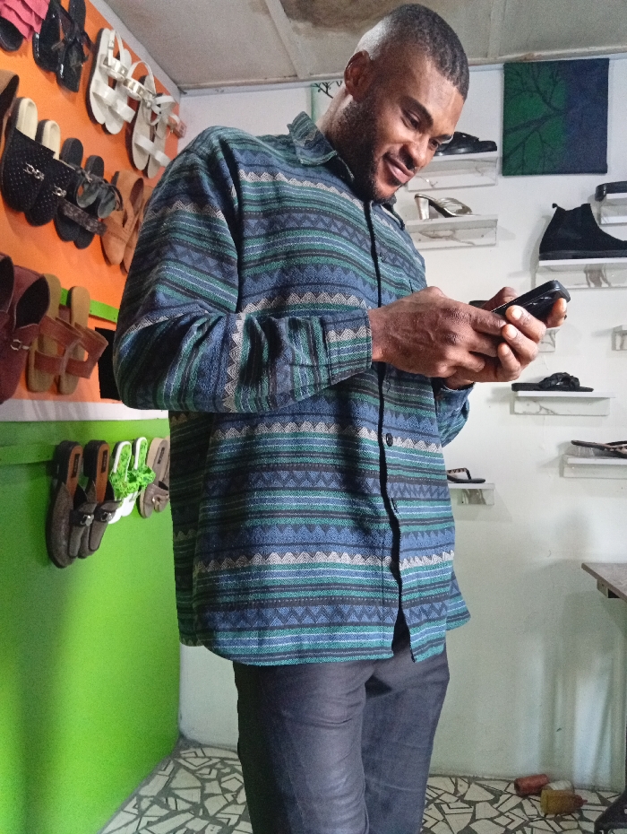 A man in a patterned blue and green shirt and dark pants looks at his phone. He stands indoors in a shop with a green wall displaying sandals and other footwear, as well as shelves of shoes. The mosaic tile floor adds to the shop's visual texture.