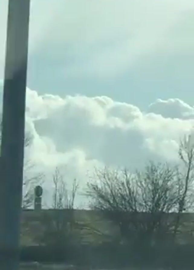 view from a moving vehicle. In the distance, large, billowing white clouds fill the sky, partly obscured by bare trees and roadside objects such as streetlights and signs. A small bird flies briefly across the view. The camera passes a white van, then focuses on bare trees against the backdrop of the cloudy sky.