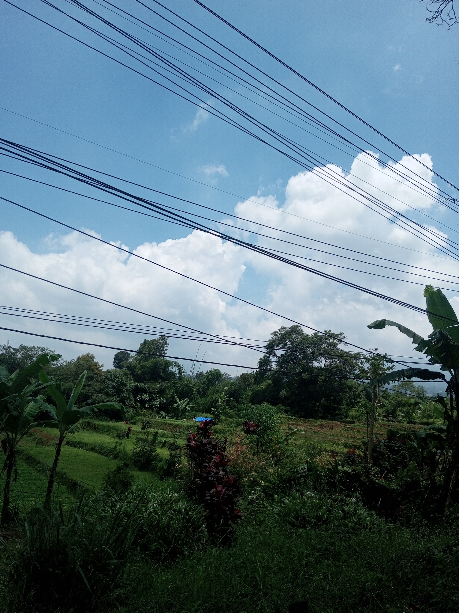 The image depicts a landscape in Kioumaknao 2, Laos, showing a lush, green environment dominated by tropical vegetation. The scene includes banana trees, various bushes and plants, and terraced rice paddies in the background. Overhead, numerous power lines intersect the sky, which is partly cloudy. A small blue structure, possibly a shelter or a temporary construction, can be seen amidst the greenery. The foreground is filled with dense vegetation, obscuring some of the view. There are no visible people.