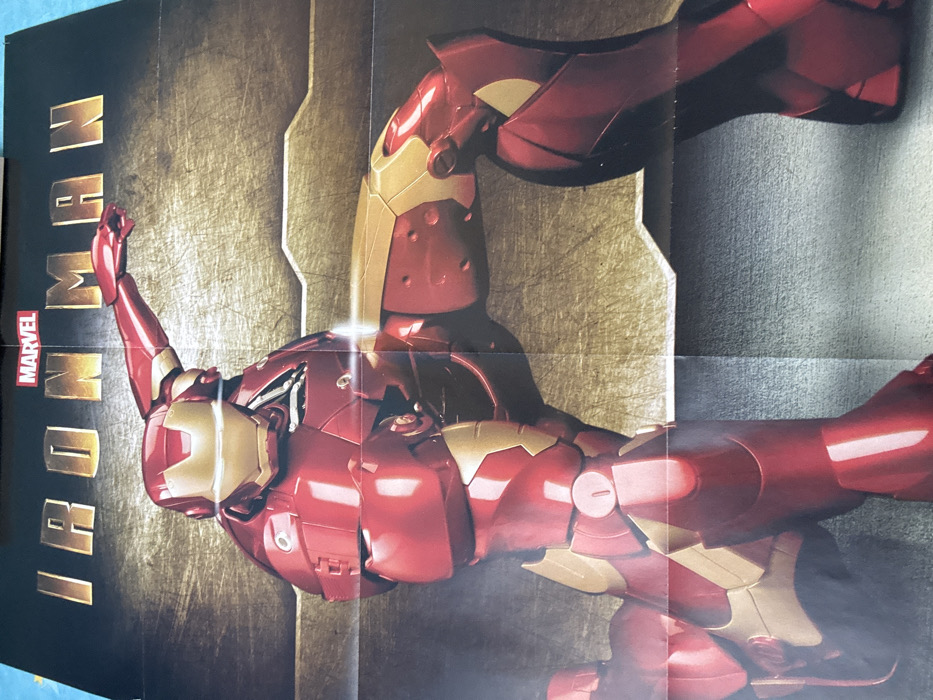 A folded poster, vertically oriented, depicts the Marvel character Iron Man in his red and gold armor