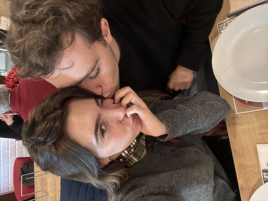 two young adults seated at a light-colored wooden table within an indoor restaurant or cafe setting in Torres Vedras, Portugal. The female subject, positioned on the left, has medium-length dark brown hair and wears a grey button-up cardigan over a plaid scarf. She exhibits a playful expression with her left eye partially closed, lips pursed, and her left hand near her chin. A thin silver ring is visible on her left ring finger, and her fingernails are painted red. Small silver hoop earrings adorn her ears. The male subject, on the right, has medium brown curly hair and wears a black long-sleeved top. He is seen kissing the female subject on her left cheek, with his eyes appearing closed or cast downwards. On the table, a white ceramic plate is visible in the bottom right, alongside a paper placemat. The background is out of focus, revealing partial figures including an individual with grey hair wearing a red top and another in a black top. Decorative elements, including red festive garland or tinsel, a red tiled wall, and a red chair, are also present in the background.