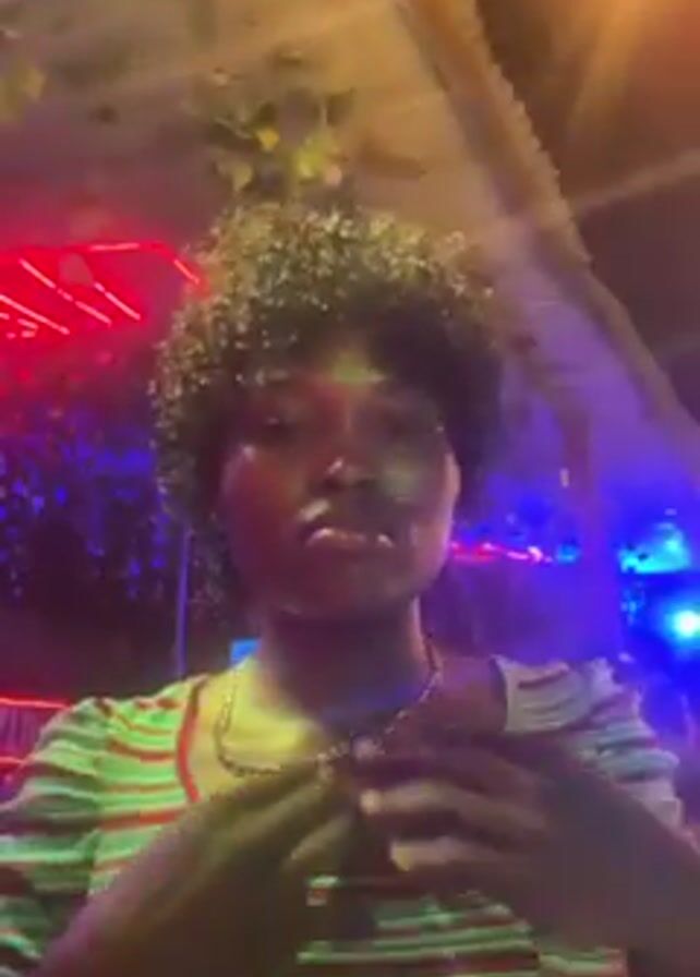A young, dark-skinned person with an afro is visible in the center of the frame. The person is wearing a striped shirt and a silver chain. They are running their fingers through their hair, possibly adjusting it. The background is brightly illuminated with red, blue, and green neon lights and some foliage. The setting appears to be outdoors, under some kind of awning.
