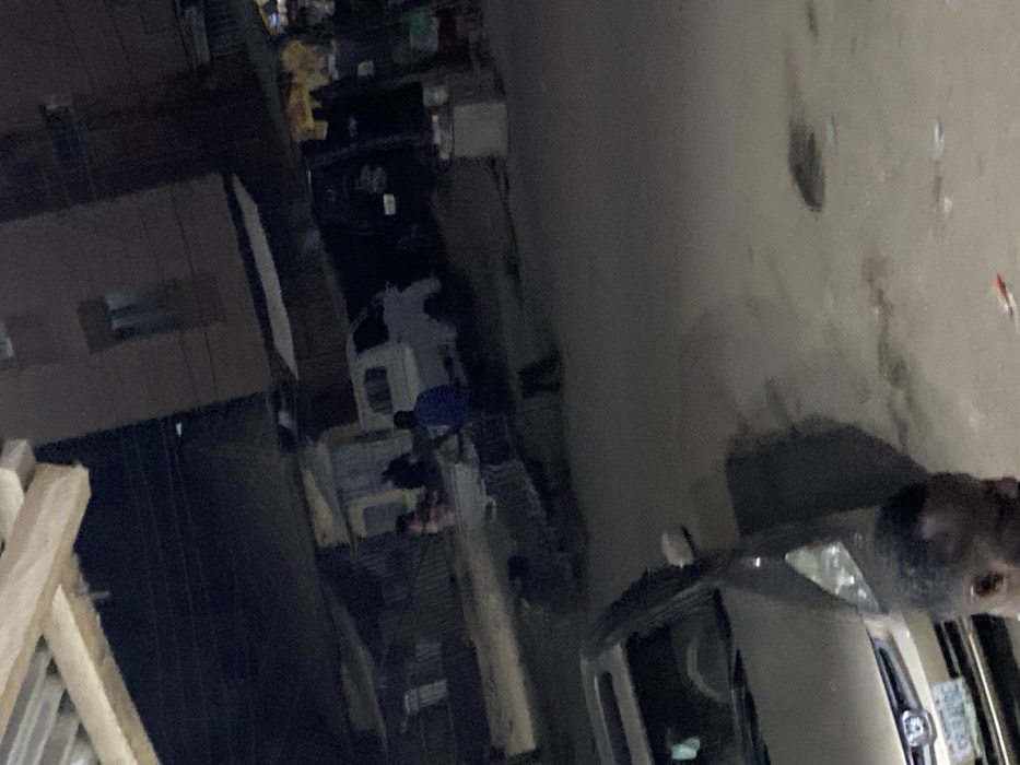 An elevated, dimly lit nighttime shot of a narrow street. Buildings flank the street on the left, some appearing to be commercial spaces with stacked items. Several people can be seen in the middle ground, possibly pedestrians or vendors. A light-colored vehicle, with the head of a person leaning close to it, occupies the bottom right corner of the frame. The street itself is gray, showing signs of wear.