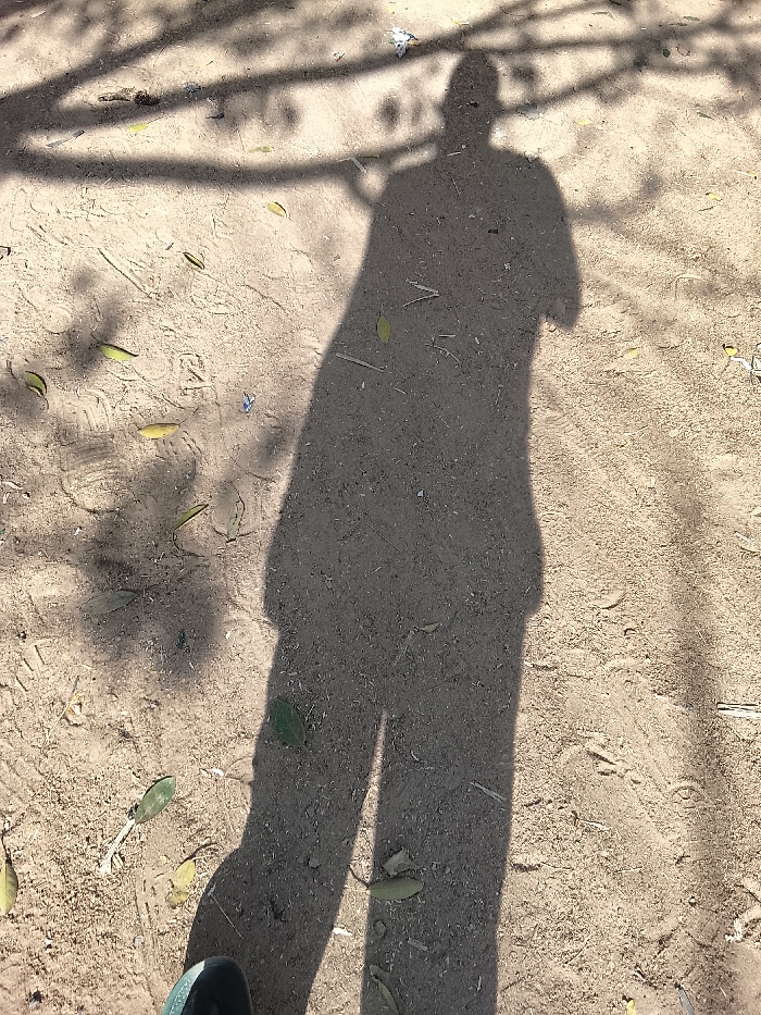 The scene, located in the city of Gama, Nigeria, displays a ground-level view of dry, light brown soil. A prominent, elongated shadow of a standing individual occupies the central and right portions of the frame, indicating an off-camera light source. Scattered green and yellowish-brown leaves, along with minor white and blue debris, are present on the sandy surface. Dappled shadows from overhead foliage are visible across the upper left and central areas. Faint footwear or tire impressions mark the ground. A partial view of a dark shoe with a light blue-green accent is visible in the bottom-left corner, likely belonging to the photographer.