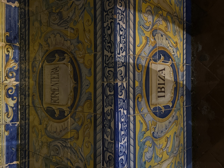 Tiled wall corner features ornate designs in yellow, blue, and white. One side displays "FORMENTERA" in a framed panel, and the adjacent side shows "IBIZA" similarly displayed. Decorative borders with intricate blue and white patterns frame the corner. The overall style appears historical, possibly Spanish, with a focus on local island names. The lighting creates shadows, highlighting the textured surface of the tiles.