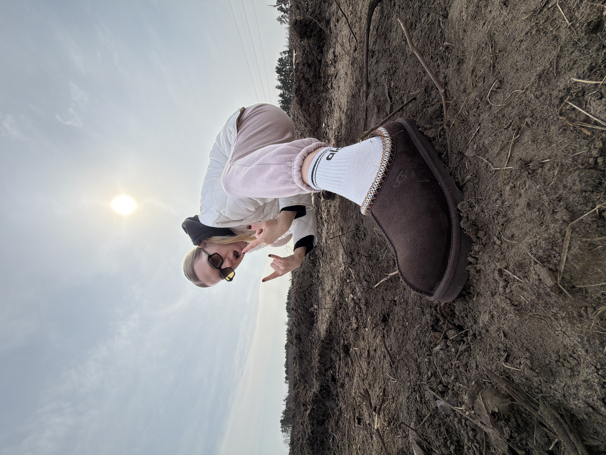 A person, likely female, is standing on soil in an area with sparse vegetation, possibly in a rural or undeveloped part of Dreiliņi, Latvia. The ground appears to be dirt and dry grass or debris. The person is wearing a white quilted jacket, pink sweatpants, and white socks with black stripes and text. A dark brown slipper or shoe is visible on one foot. They are also wearing sunglasses and a black beanie or hat. They are making a "rock on" hand gesture with both hands. The sky is visible in the background with a bright sun. Powerlines are visible in the background. The perspective is angled and the image is rotated counterclockwise.