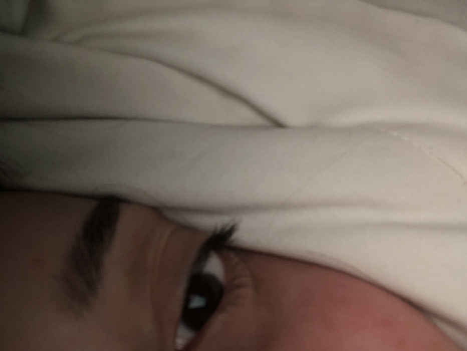 The image presents a close-up view of the upper-left quadrant of a human face, appearing to be partially obscured by fabric in a dimly lit indoor environment