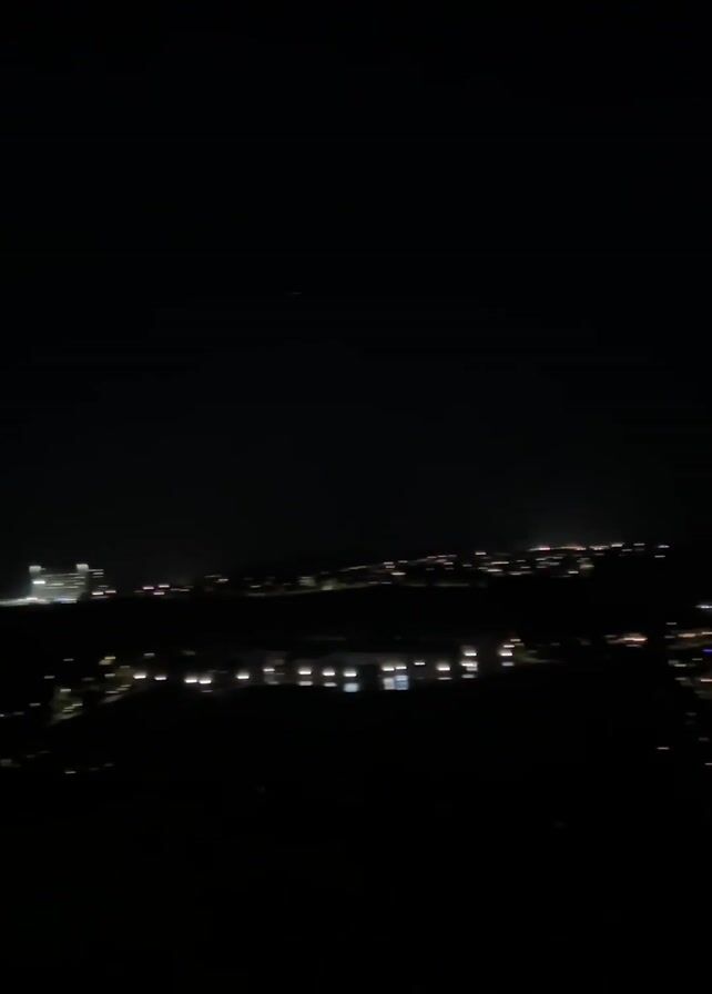dark, nighttime view of a city landscape from a high vantage point. The city lights are visible in the distance, creating a blurred effect due to camera movement. There are no people or specific objects clearly discernible in the foreground. The focus is on the illuminated cityscape against the dark sky.