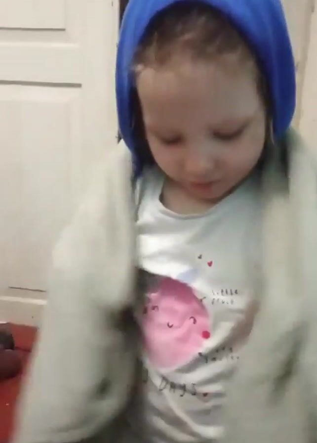 A small child stands wrapped in a gray towel, with a blue towel wrapped around their head, in an indoor environment. The child wears a white t-shirt with a graphic design and a light-colored tutu. They are looking down and then up at the camera, speaking indistinctly. A person wearing a gray top walks behind the child into a doorway in the background, partially obscured. The surrounding environment includes a white door and a glimpse of an orange floor.