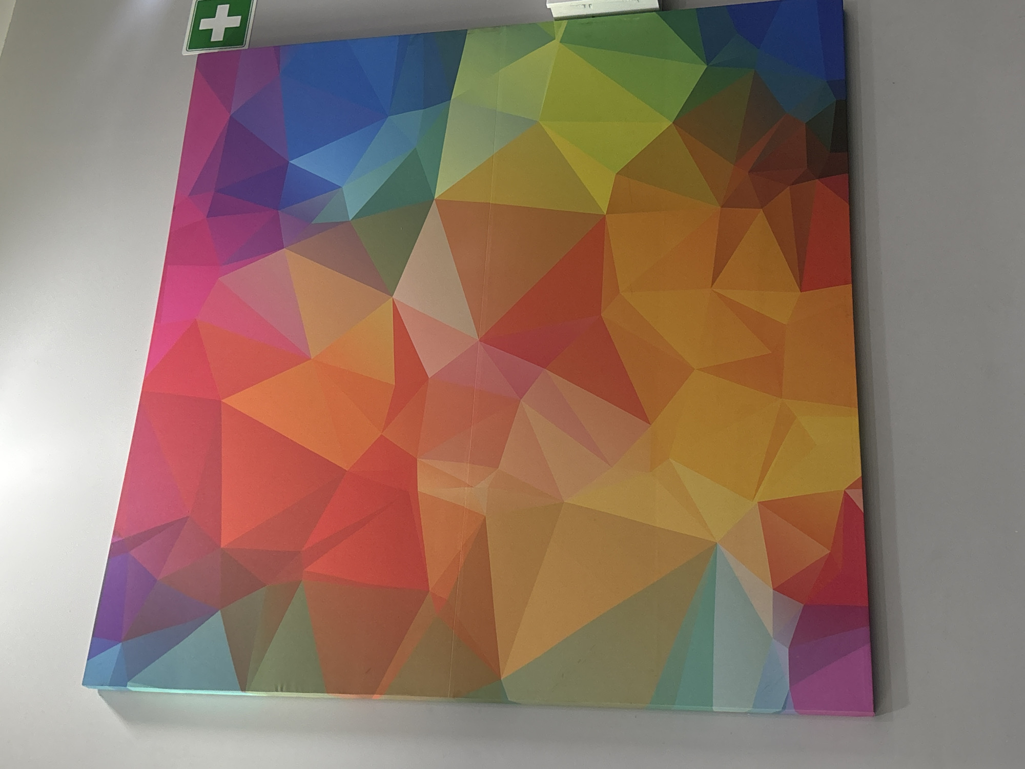 The scene depicts a large, rectangular piece of artwork mounted on a plain, light grey wall. The artwork features an abstract geometric pattern composed of numerous interconnected triangular and polygonal shapes. These shapes display a wide spectrum of colors, including various shades of red, orange, yellow, green, blue, and purple, arranged to create a vibrant, low-polygon style visual. The top edge of the artwork is close to the top of the visible wall section. To the upper right of the artwork, a square green sign with a white cross, indicative of a first aid point, is affixed to the wall. A narrow, vertical white strip, possibly a cable channel or conduit, is partially visible along the right side of the artwork. The wall appears smooth and uniformly lit. No individuals or specific interactions are present. The location is an interior wall in the city of Buenavista, Mexico. The specific building or room within Buenavista is not discernible from the visual evidence.