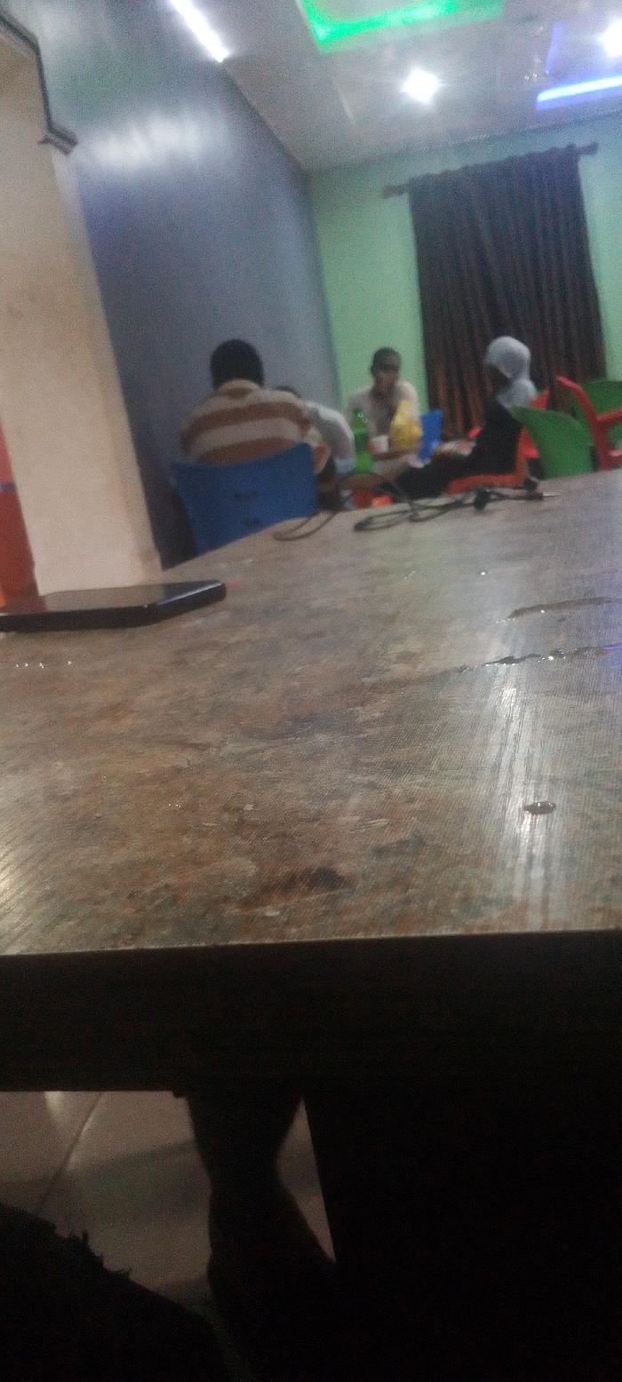 close-up view of a table with a brown, wooden surface. The table is wet with water droplets, creating a reflective sheen. A black smartphone lies on the table, positioned to the left of the frame. The background depicts the interior of an establishment, likely a cafe or restaurant, in Idah, Nigeria, located at coordinates 7.135 latitude and 6.755 longitude. Three individuals, partially obscured from view, are seated at a table in the distance. The individuals are partially obscured, making it difficult to discern their features or activities. The room features a light blue wall, a white ceiling, and a brown curtain in the background. Two green chairs are visible, along with a red chair. The image suggests a casual and informal setting.
