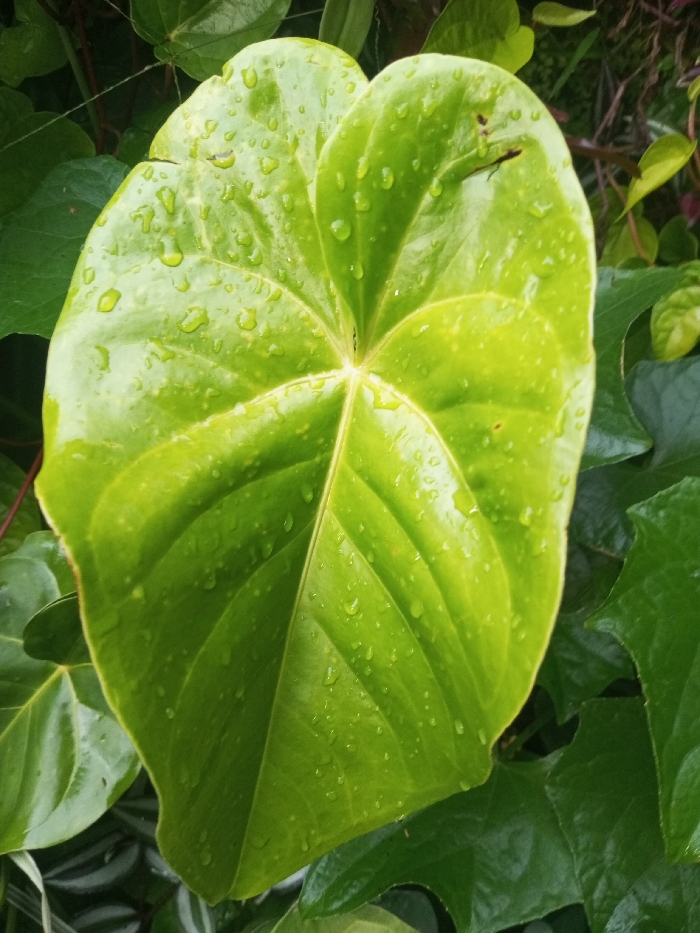 A large, bright green heart-shaped leaf dominates the image