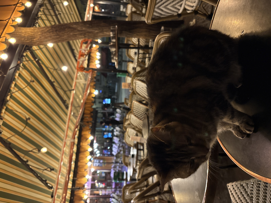 A cat sits on a table in an outdoor cafe