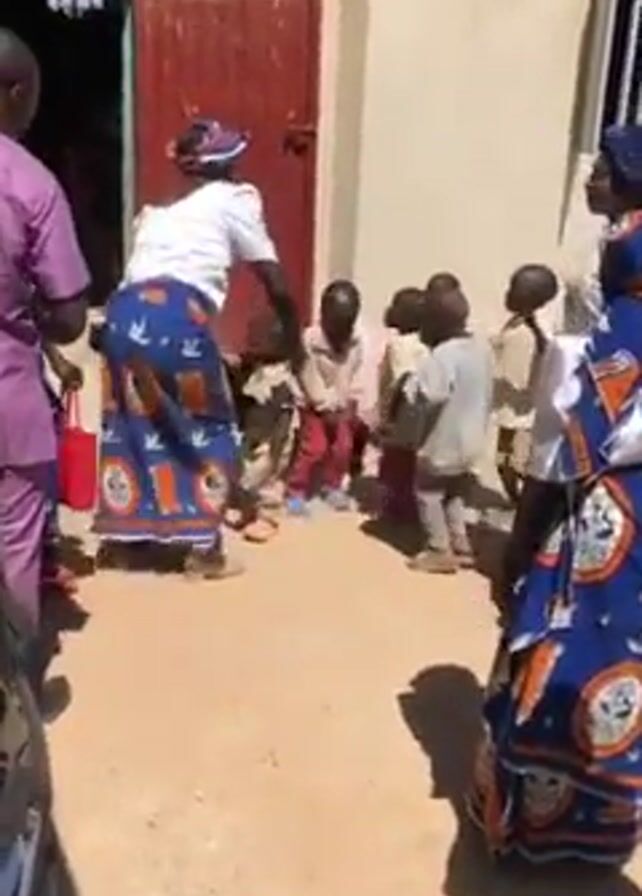 group of young children dancing in a dusty, outdoor area in front of a light-colored building with a red door. They are surrounded by several women who appear to be adults, some wearing matching outfits consisting of a white top and a blue and orange patterned skirt. The women are smiling and clapping, encouraging the children. A man in a purple shirt is also visible on the left side of the frame, partially obscured by a car. The children, dressed in various light-colored clothes, are moving and dancing, seemingly enjoying the music. The background features a simple building with a barred window. The overall atmosphere appears joyful and celebratory.