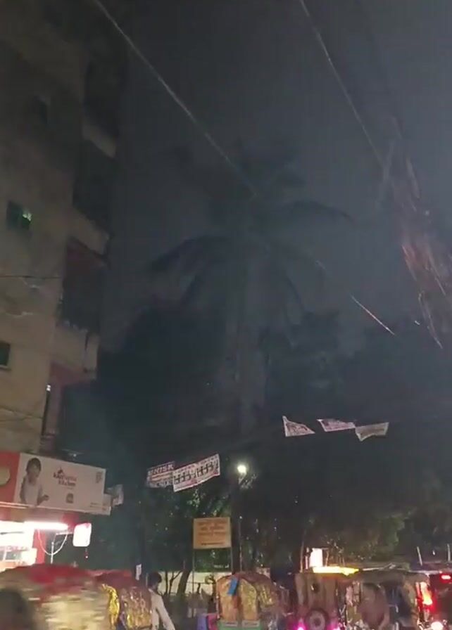 The video captures a nighttime street scene. A tall palm tree stands as a focal point against the dark sky. Several rickshaws are in motion, moving along a wet street. Electrical wires crisscross overhead. Buildings line the street, illuminated by scattered light sources. A storefront with a sign is visible. Suddenly, a flash of lightning illuminates the sky.