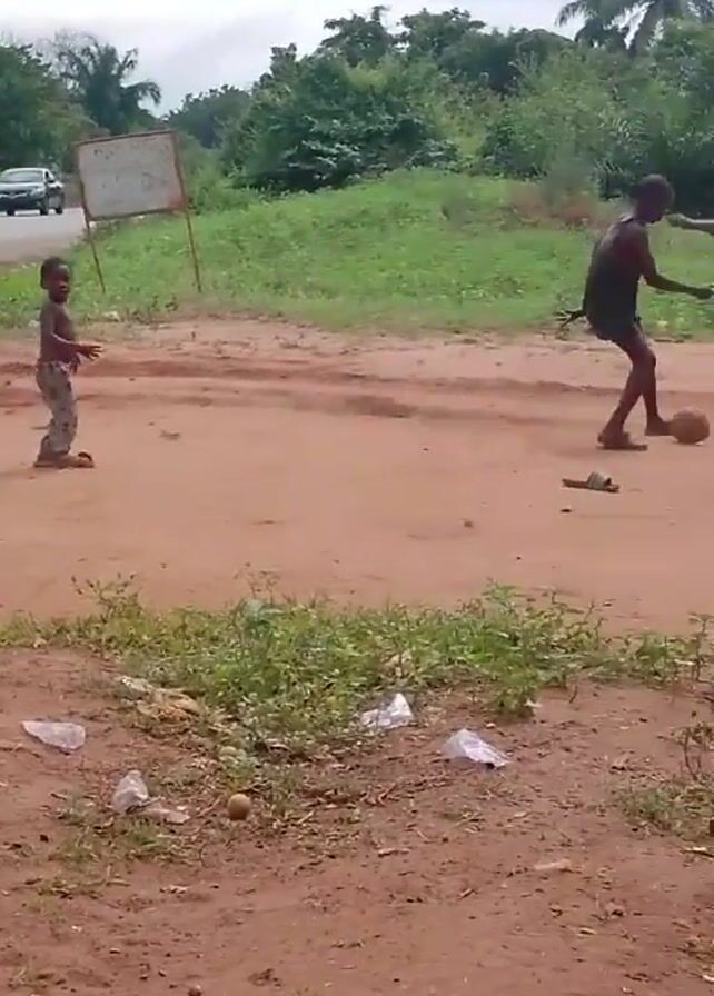 three young boys playing with a round object on a dirt road. Two of the boys wear t-shirts and pants while one is shirtless. One boy is kicking the round object while the other two watch. The road is surrounded by green foliage, and there is a small pile of litter in the foreground. A car drives by in the background. In the background is a wall made of brick. A pair of shoes sits on the ground.