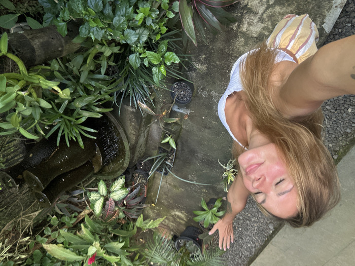 A female subject is depicted in an outdoor garden setting in Ungasan, Indonesia. She has light brown hair and is wearing a white ribbed tank top with vertical striped yellow and white shorts. Her head is tilted back, eyes closed, and both arms are raised and extended outwards. She is holding a camera device in her left hand, indicating a selfie. The foreground and left side of the scene feature a concrete path interspersed with gravel. To the right and background, there is dense tropical foliage, including various green plants, some cultivated in black pots. A dark, multi-tiered water feature with visible flowing water is situated in the upper right quadrant of the image, surrounded by vegetation. A single red flower is present among the plants in the upper center-right. The scene is illuminated by natural daylight.