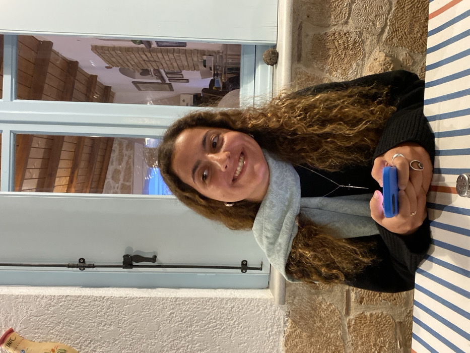 A young woman with long, curly brown hair, fair complexion, and a broad smile is seated at a table