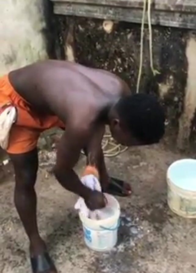 A shirtless Black man wearing orange shorts and black sandals is washing clothes in a white bucket. He is scrubbing a white cloth in the bucket, which appears to contain soapy water. Another bucket filled with water stands next to him. He is outside, near a wall that has visible mold and discoloration. A yellow rope hangs from the top of the wall.